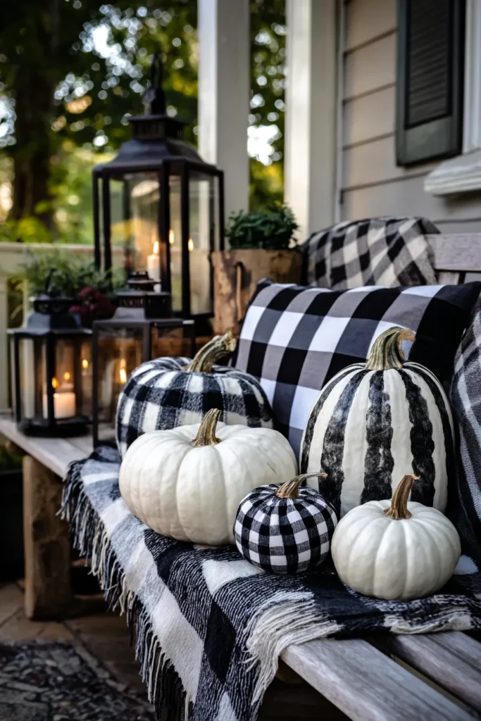 A mix of white, black, and plaid-patterned pumpkins are styled on a porch bench with checkered pillows and lanterns. The look is cozy and farmhouse-inspired, creating a welcoming fall entryway.