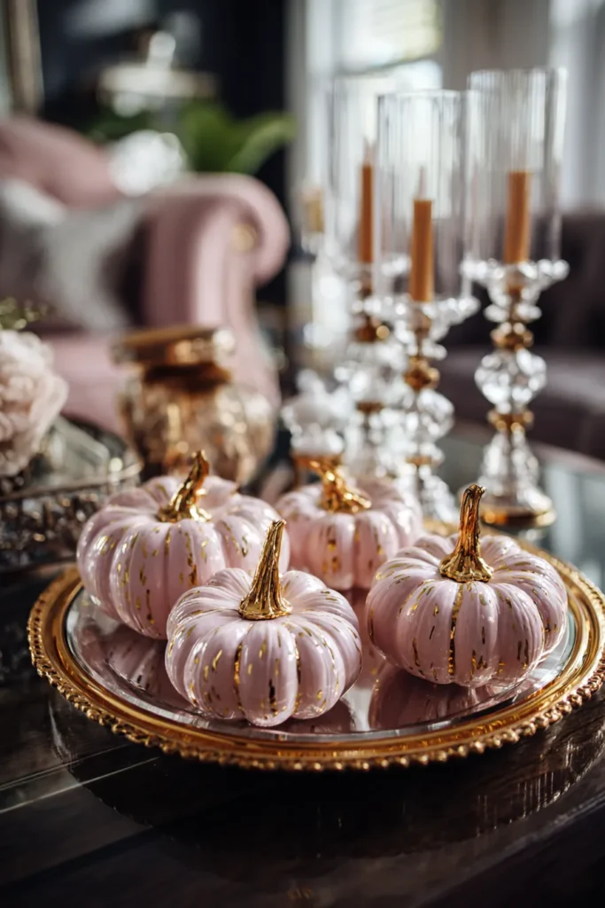 Soft pink pumpkins with shiny gold stems and delicate gold flecks are arranged on an ornate tray. Surrounded by elegant glass candlesticks and plush furniture, the display feels luxurious and feminine, almost like a little piece of seasonal jewelry for the living room.