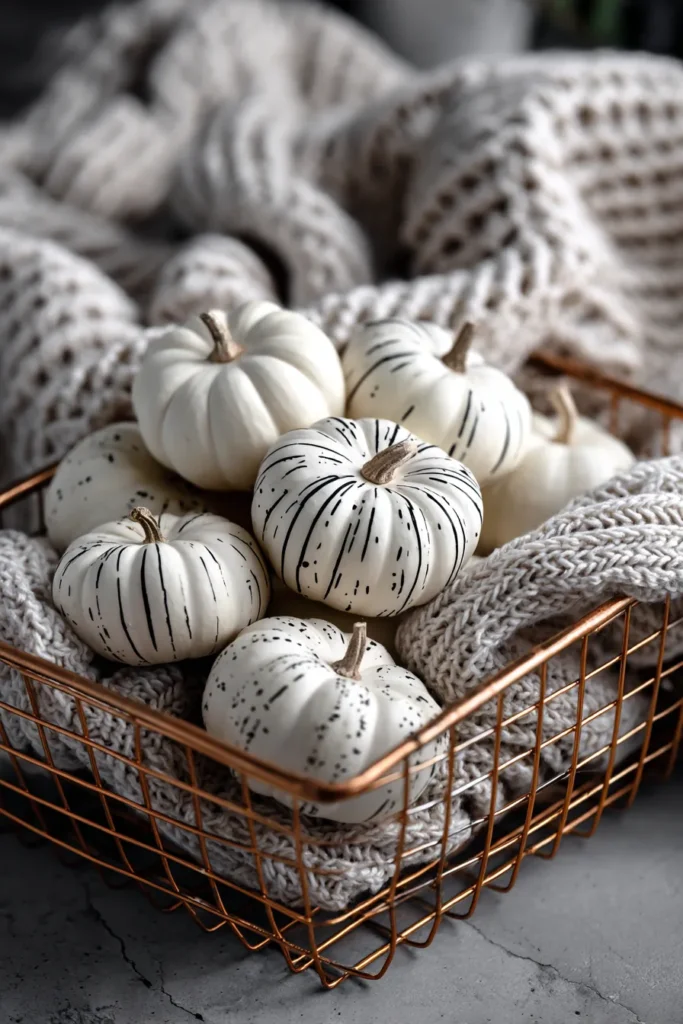 White pumpkins with thin black stripes and speckles are styled in a copper basket filled with cozy knit blankets. The simple design keeps them modern and minimal, while the soft textures around them add warmth and comfort.