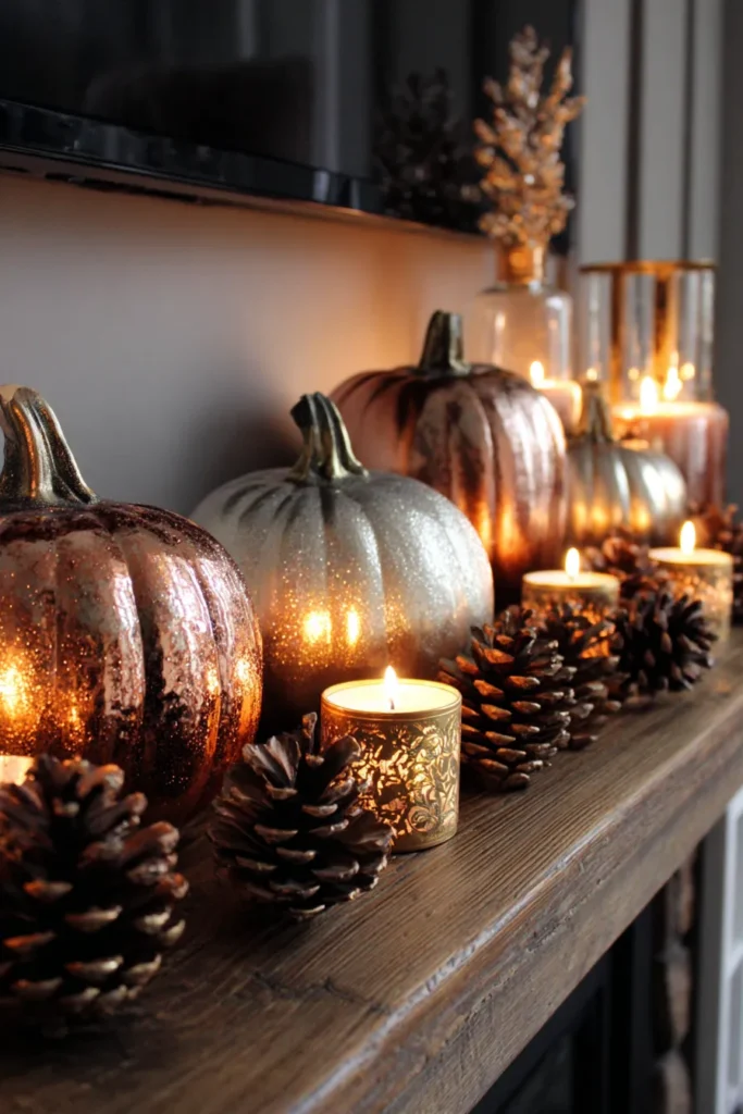 Shiny pumpkins in shimmering copper and silver tones line a mantel with glowing candles and pinecones. The reflective surfaces catch the light beautifully, creating a warm, festive atmosphere that feels perfect for autumn evenings.
