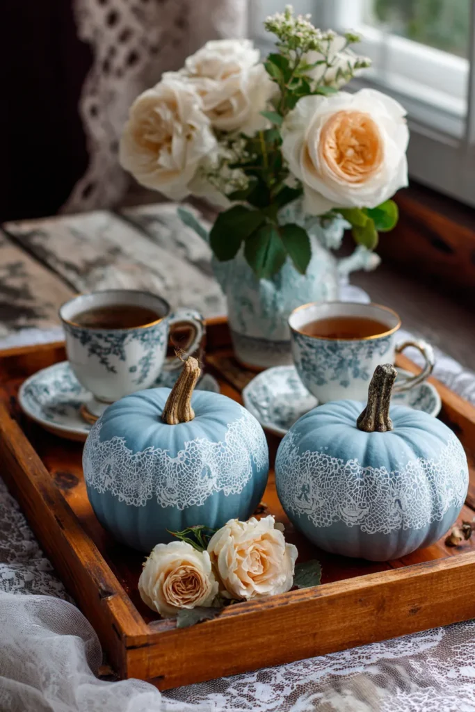 Powdery blue pumpkins decorated with delicate white lace patterns sit on a rustic wooden tray, styled with roses and vintage teacups. The design feels soft and romantic, like something out of a charming tea party.