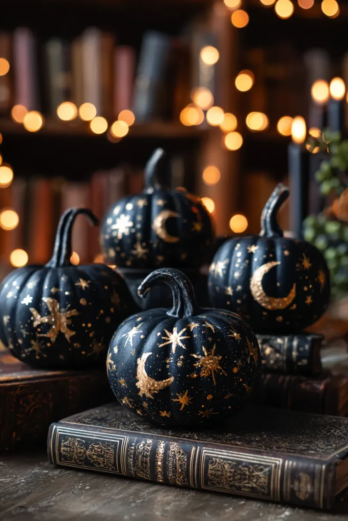 Black pumpkins covered in golden moons and stars create a dramatic, magical effect. Displayed against old books and surrounded by warm twinkling lights, the design feels both whimsical and mysterious, like a page from a storybook.