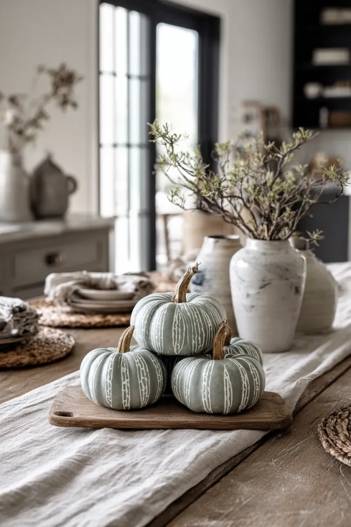 Painted in a muted sage green with vertical white striping, these small pumpkins bring a clean, contemporary look to the dining table. Styled with natural linens and earthy vases, the overall effect is fresh and simple, yet stylish.
