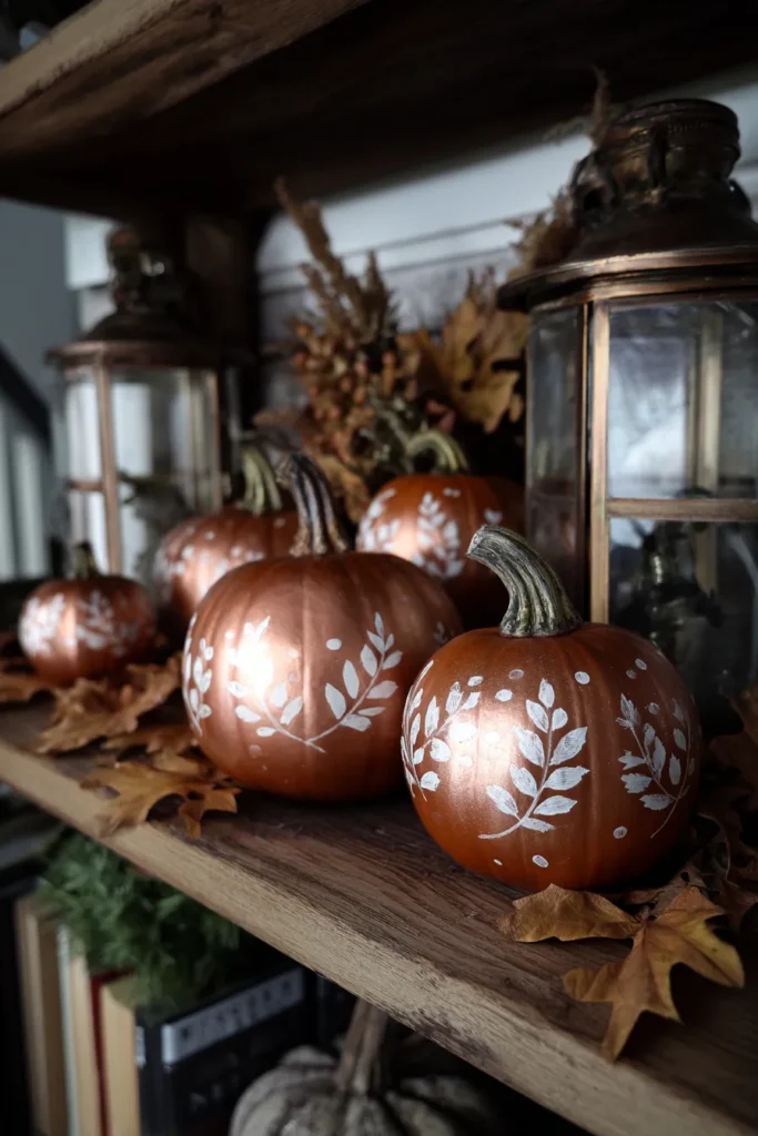 Rich copper-painted pumpkins decorated with white leafy patterns sit among lanterns and autumn leaves. The warm metallic shine pairs beautifully with rustic wood shelving and vintage accents, giving the scene a cozy yet polished feel.