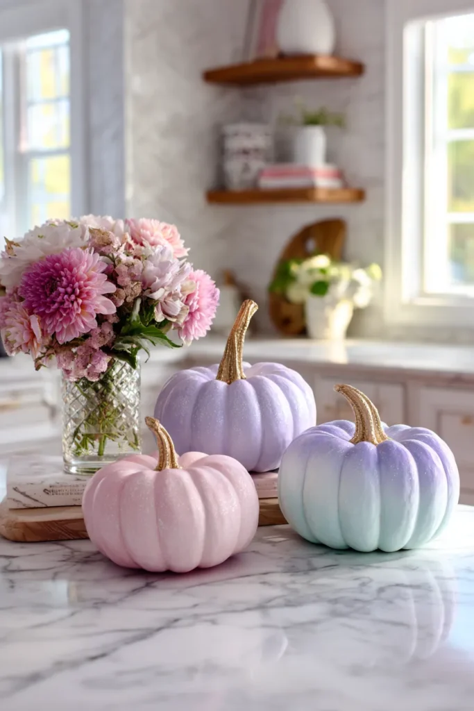 Painted in soft pastel shades of pink, lavender, and blue with a touch of sparkle, these pumpkins look playful and dreamy. Styled with fresh flowers in a bright kitchen, they feel cheerful and feminine, adding a fresh spin on fall decorating.
