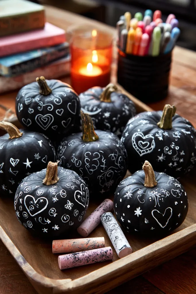 These black pumpkins are covered in playful white chalk-style doodles, from hearts to stars and swirls. They sit on a tray with chalk sticks nearby, making them interactive and fun for kids or anyone who loves to get creative.
