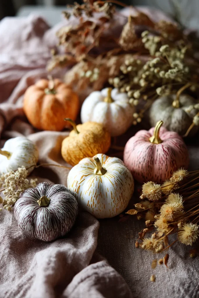Painted in soft earthy shades with fine brush stroke patterns, these pumpkins bring a handmade, artistic touch. Surrounded by dried flowers and cozy linens, they create a rustic yet stylish arrangement that feels warm and natural.
