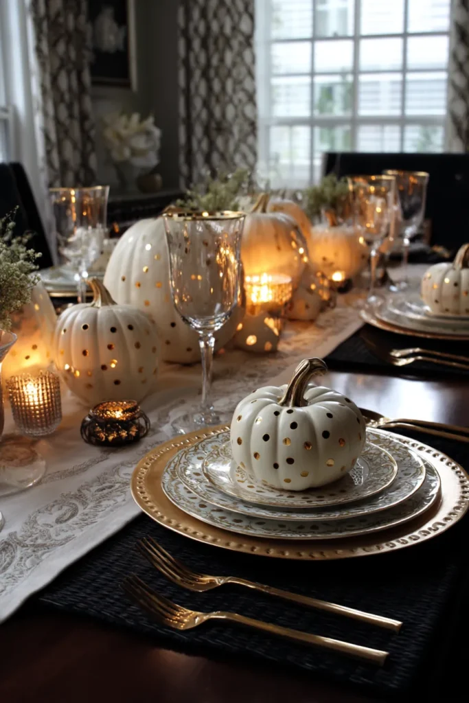 White pumpkins dotted with golden metallic circles are styled as part of a glamorous dining setup. Paired with fine china, candlelight, and sparkling glasses, the look is luxurious yet festive, perfect for a fall dinner party.