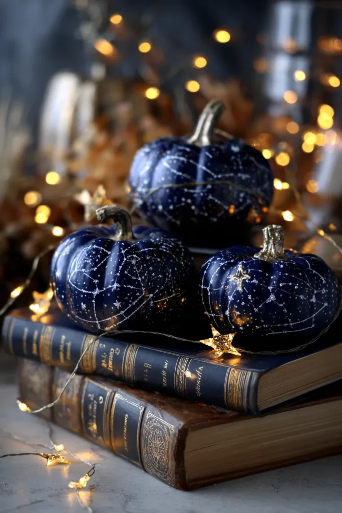 Dark blue pumpkins are painted with delicate constellations in white and silver, glowing softly with fairy lights. Stacked on vintage books, they have a dreamy, magical quality that feels straight out of a stargazer’s imagination.