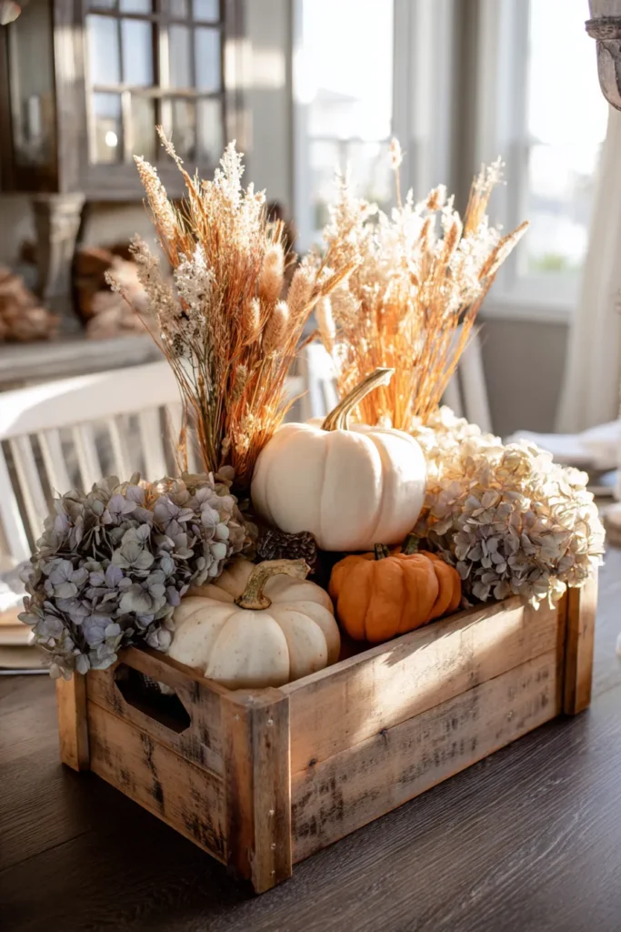 A rustic wooden crate is filled with pumpkins in cream and orange tones, accented by dried hydrangeas and wheat stalks. The natural textures and soft autumn colors make it feel charming and farmhouse-inspired.