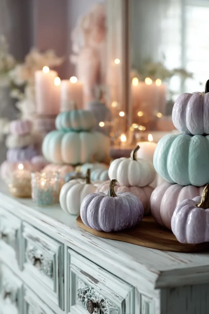 A shabby chic dresser is styled with pumpkins painted in dreamy pastel shades of lavender, mint, and blush. Soft candlelight and fairy lights add a warm glow that makes the whole space sparkle like a cozy autumn fairytale.