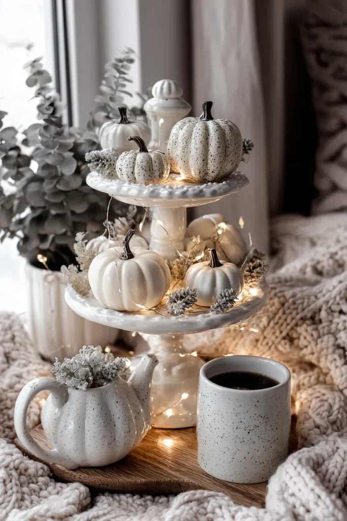 A white tiered tray is decorated with speckled and cream mini pumpkins, sprinkled with fairy lights and tiny frosted sprigs. The setup is surrounded by chunky knit blankets and a warm cup of coffee for the perfect cozy corner.