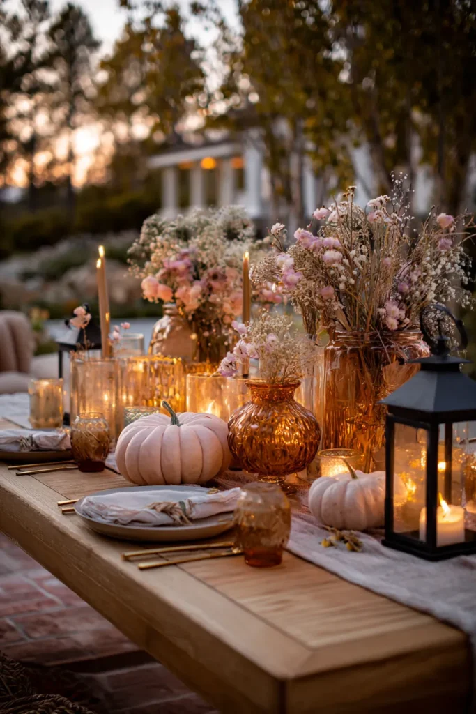 An outdoor dining table is styled with pale blush pumpkins, amber glass vases, dried florals, and flickering candles. The soft golden hour light makes everything glow beautifully, creating a dreamy evening setup.