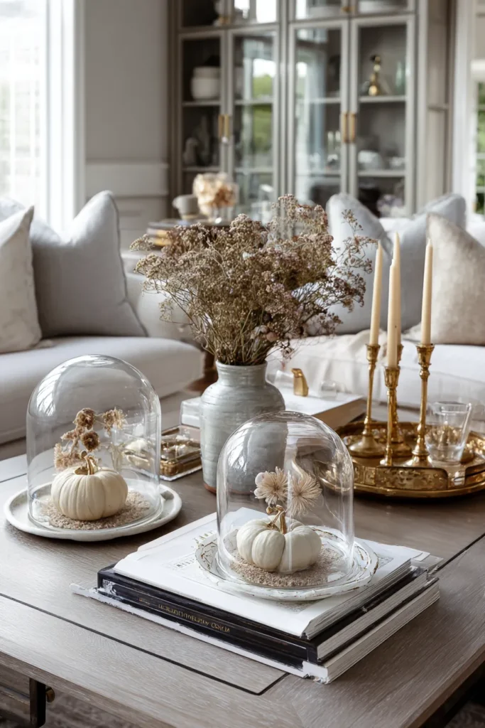 A coffee table features pumpkins displayed under glass cloches, paired with delicate dried flowers. Soft gold candlesticks and neutral decor complete the look, creating a refined and elegant fall arrangement.