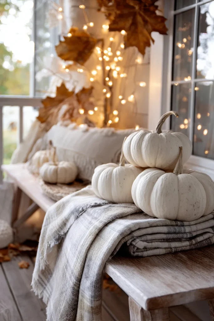 This dreamy setup features a rustic wooden bench layered with soft plaid blankets and topped with pale white pumpkins. In the background, golden leaves and glowing fairy lights create a gentle sparkle, making the whole corner feel like a cozy autumn retreat.