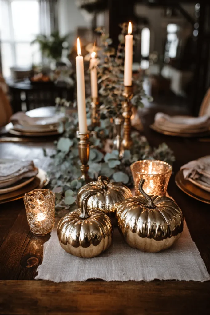 A dark wooden dining table is styled with shiny metallic pumpkins as the star centerpiece. The look is elevated even further with tall candlesticks, delicate greenery, and glowing tea lights scattered across a crisp linen runner.
