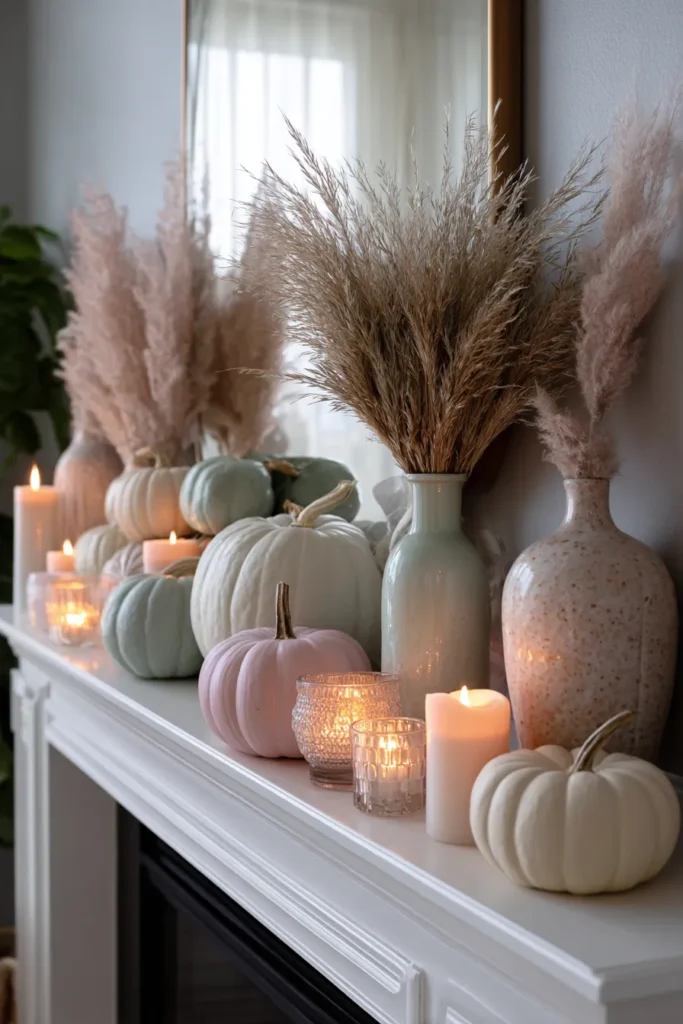 A mantel is decorated with pumpkins in soft pastel shades of mint, blush, and cream, paired with tall vases of pampas grass and glowing candles. The muted colors and natural textures create a soft, airy look that feels fresh and modern.