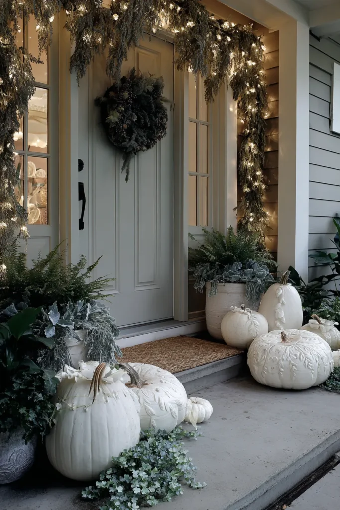 This entrance is styled with white carved pumpkins, oversized planters filled with greenery, and a garland of twinkling lights draped around the doorway. The muted gray door and simple wreath tie everything together with understated charm.