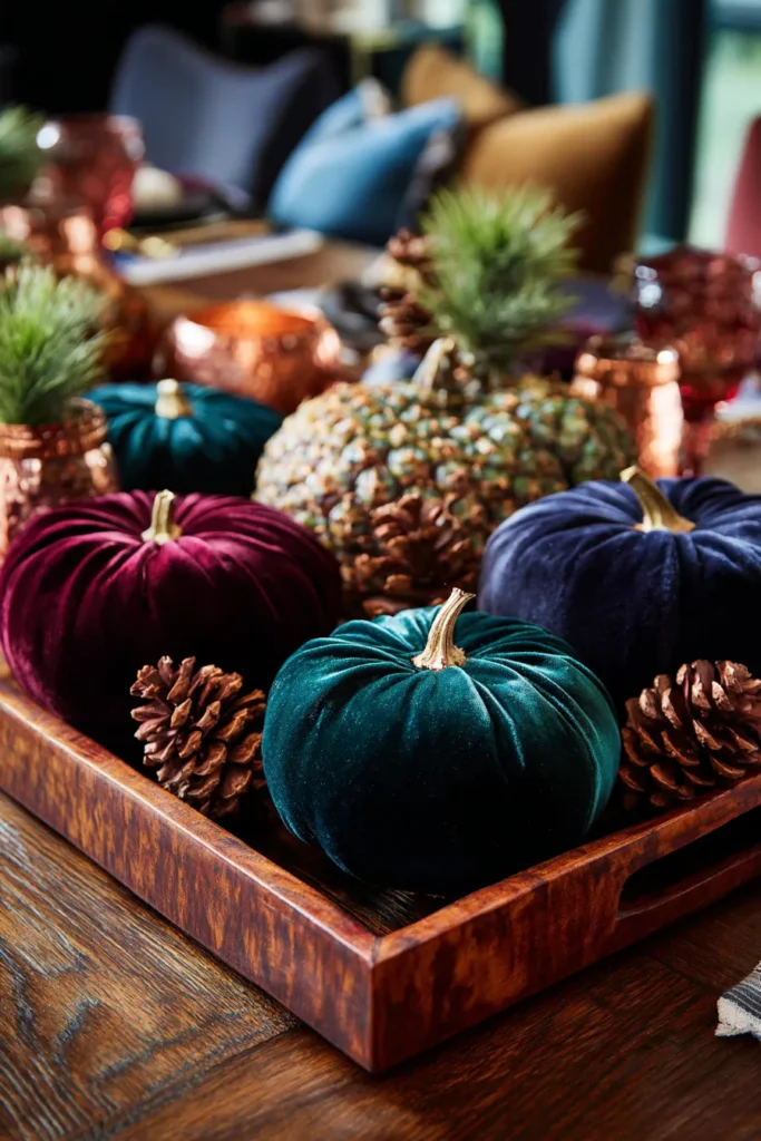 A wooden tray on a dining table holds plush velvet pumpkins in deep shades of emerald, burgundy, and navy. Pinecones and copper accents complete the look, creating a rich and luxurious autumn display.