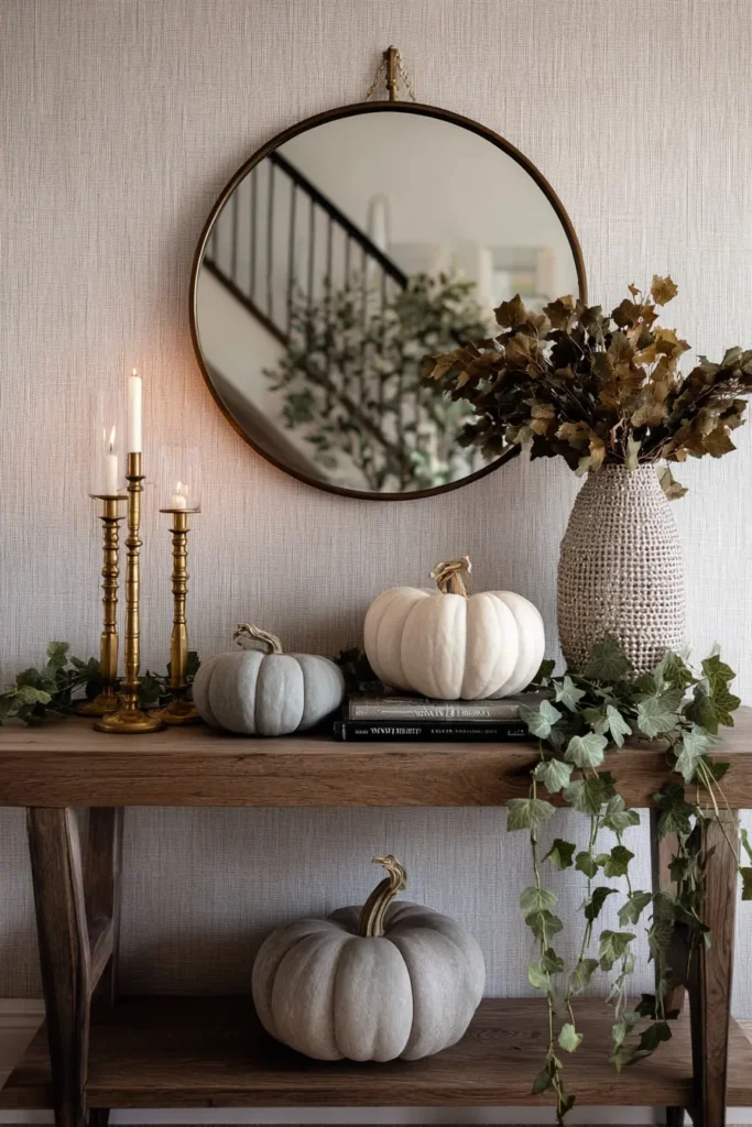 A wooden console table is styled with neutral pumpkins in soft white and gray tones. Brass candlesticks and a textured vase filled with golden leaves add height, while a trailing ivy garland softens the look. A round mirror above reflects the cozy setup.
