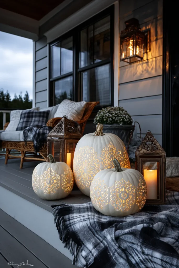 I adore how magical this feels. The patterns carved into the pumpkins look like lace, and when they’re lit, it’s just enchanting. It’s one of those setups that makes a house feel instantly inviting on a chilly night.