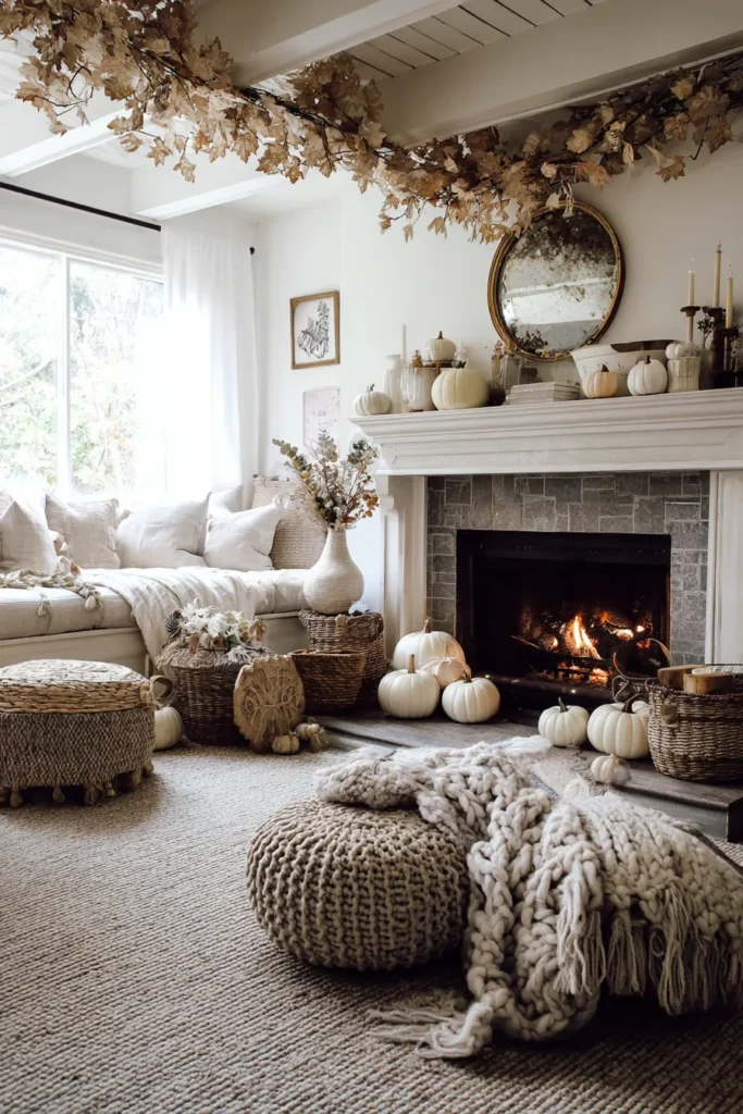A living room fireplace is styled with layers of soft white pumpkins along the mantel and hearth. Natural textures like woven baskets, chunky knit blankets, and dried flowers complete the warm fall look.