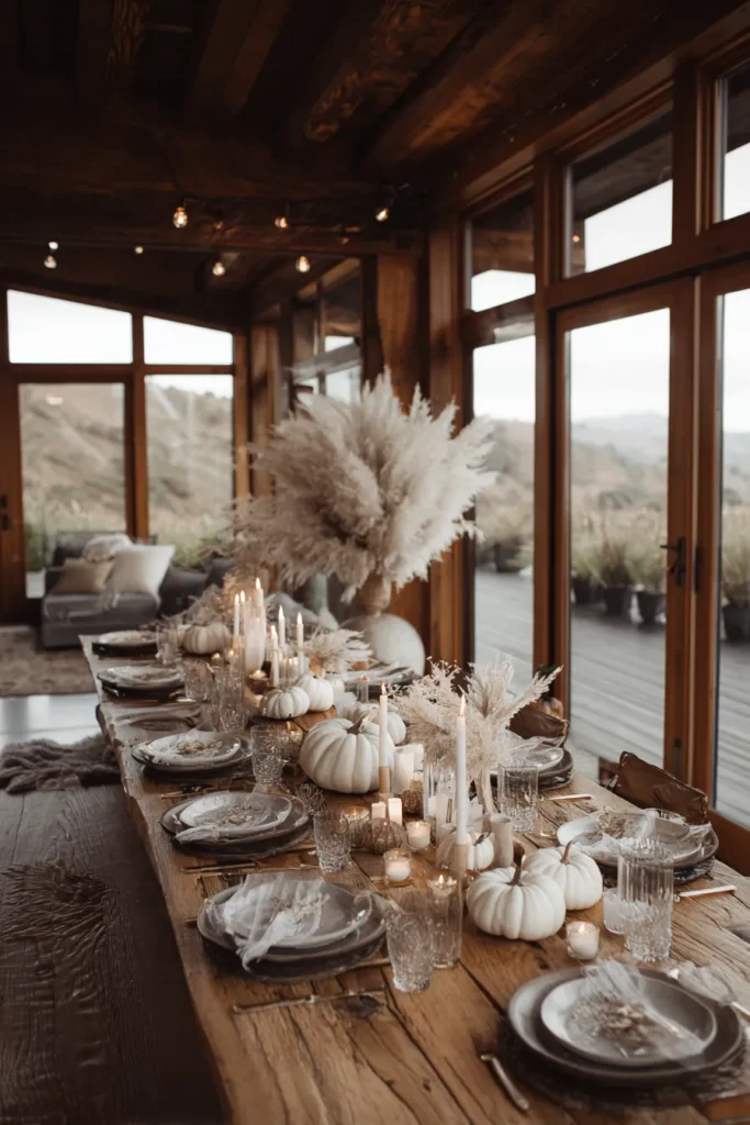 A long wooden dining table is dressed with clusters of white pumpkins, tall candles, and pampas grass in oversized vases. The soft candlelight reflects off glassware, creating a romantic and dreamy fall dinner setting.