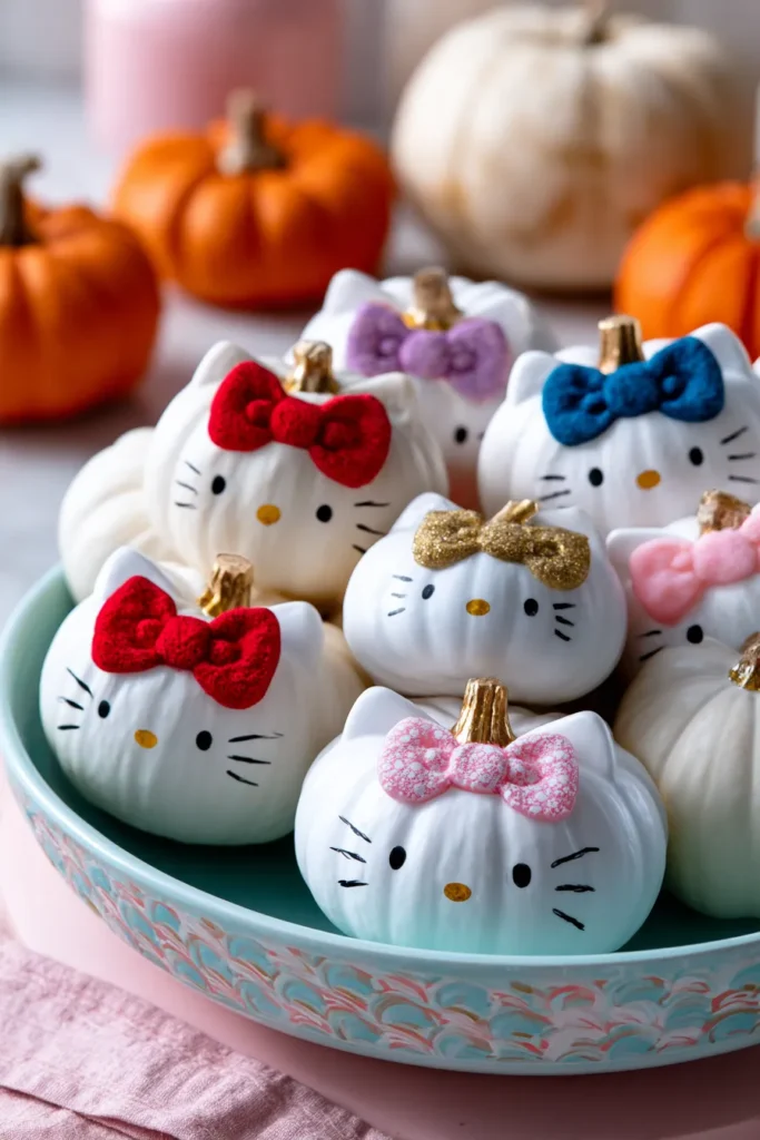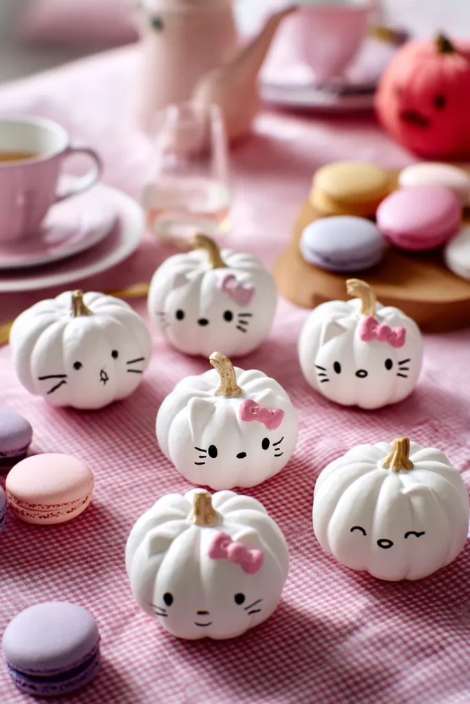 A group of tiny white pumpkins has been turned into a sweet Hello Kitty family. Each one has a hand-painted face, with soft pink bows and simple black details, making them perfect for scattering across a tea party table.