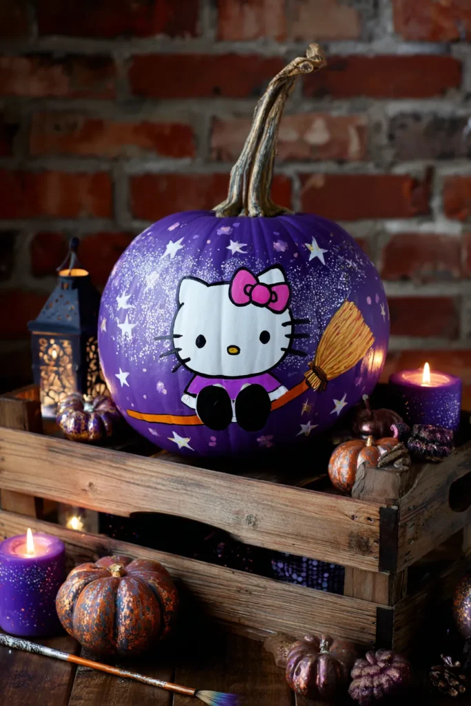 This pumpkin is painted a deep purple sky filled with stars, with Hello Kitty riding a broomstick across the front. The whimsical scene is set against rustic wood and glowing candles, creating a cozy Halloween vibe.