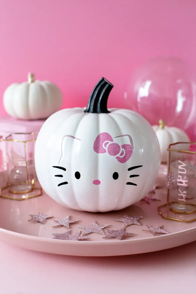 A crisp white pumpkin is decorated with a simple Hello Kitty face, accented with a glittery pink bow and matching nose. Styled on a pink backdrop with star cutouts, the look is fresh and modern.