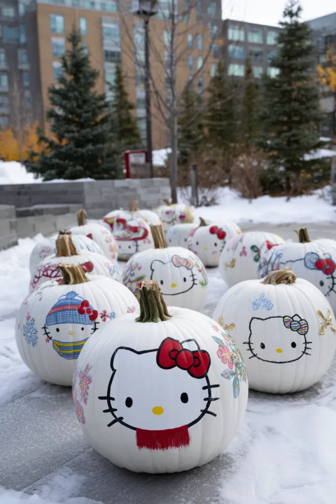 A whole patch of white pumpkins has been turned into Hello Kitty characters, each with different accessories like scarves, bows, and winter hats. The snowy background makes them look even more festive and cheerful.