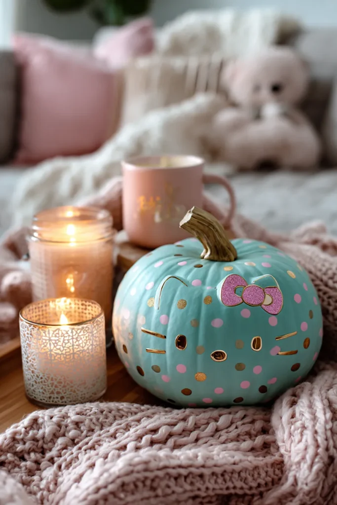 This pumpkin is painted a soft teal color and dotted with shiny gold and pink polka dots. Hello Kitty’s face is outlined with metallic details, and her bow sparkles in glittery pink. Surrounded by candles and knits, it feels wonderfully snug.