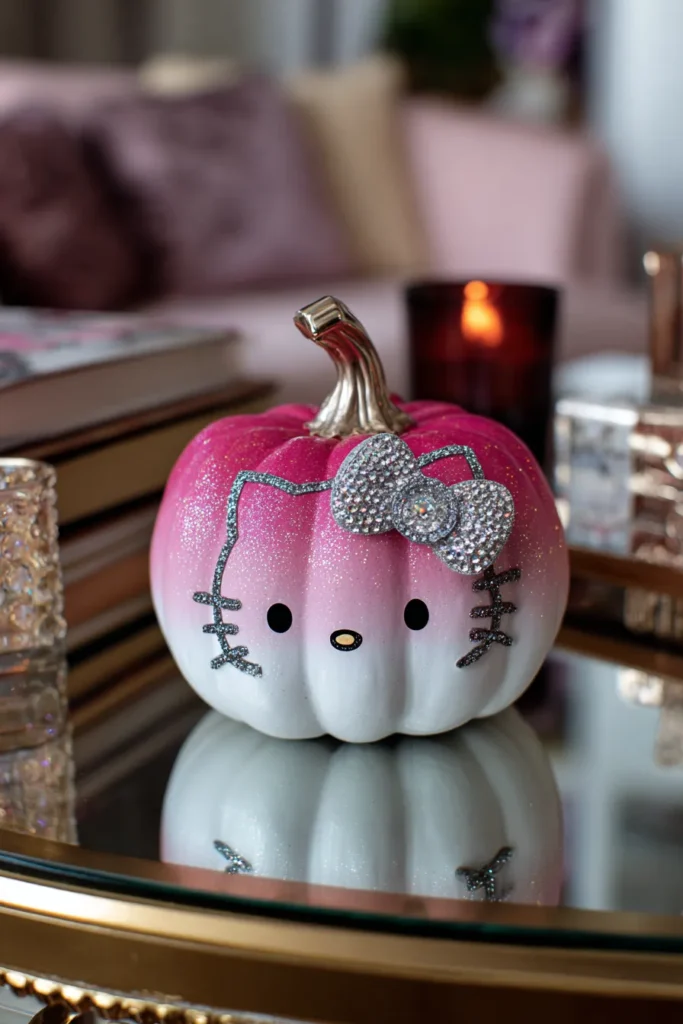 This pumpkin is painted in a stunning ombre that fades from hot pink to crisp white. The glittery Hello Kitty face sparkles with rhinestone whiskers and a dazzling jeweled bow, giving it a chic yet playful vibe.