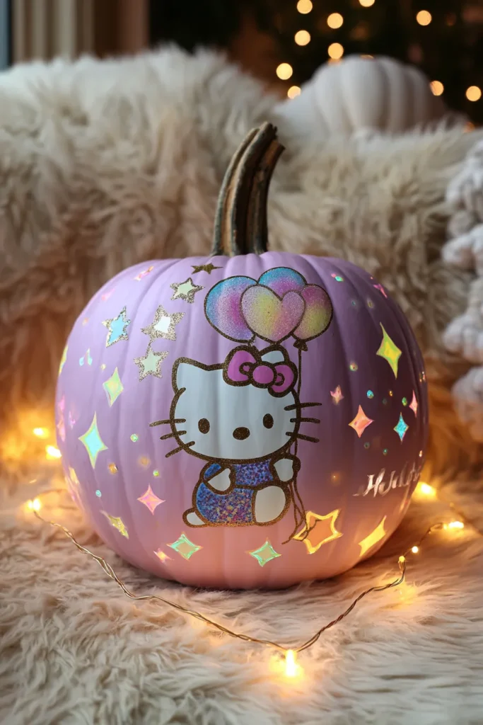This pumpkin is covered in a soft lavender hue with Hello Kitty holding pastel balloons painted on the front. Sparkly star decals surround her, and fairy lights twinkle around the base for an extra dreamy touch.