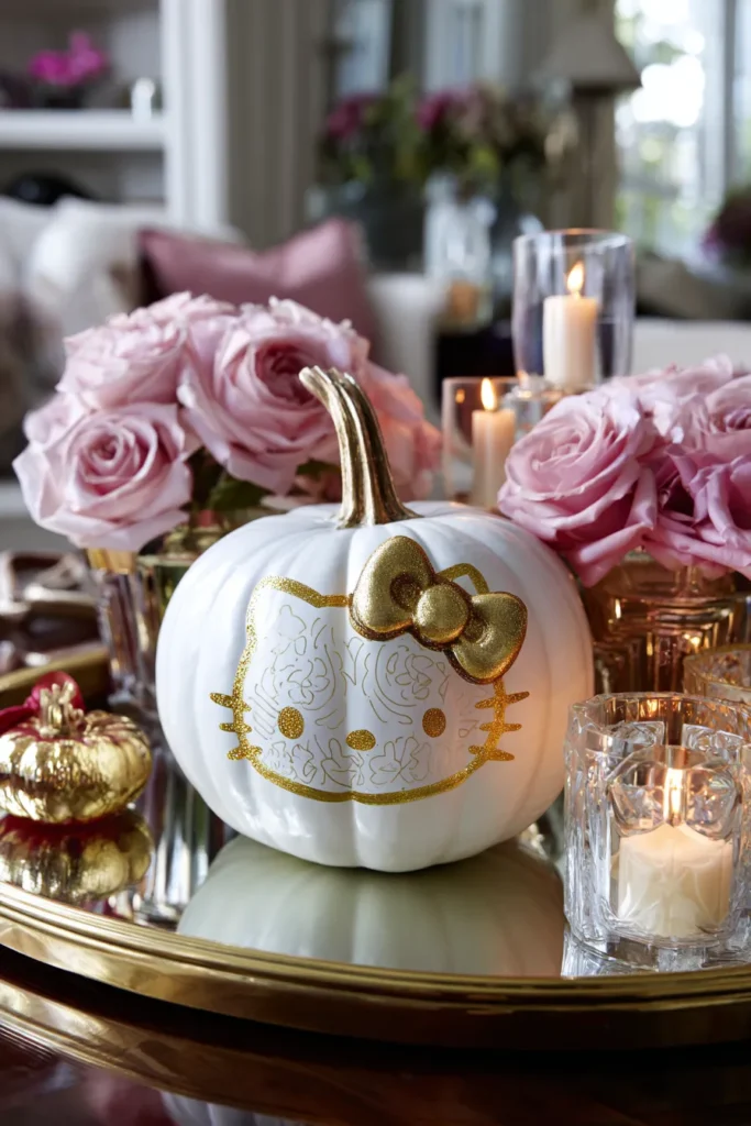 A crisp white pumpkin is decorated with a golden Hello Kitty outline, complete with a shiny metallic bow. Surrounded by blush roses and glowing candles, it has an upscale and refined look.