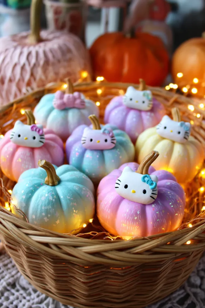 A basket full of pastel pumpkins shines in soft shades of blue, purple, and pink. Each pumpkin is topped with a little Hello Kitty head wearing colorful bows, while fairy lights glow around the basket.