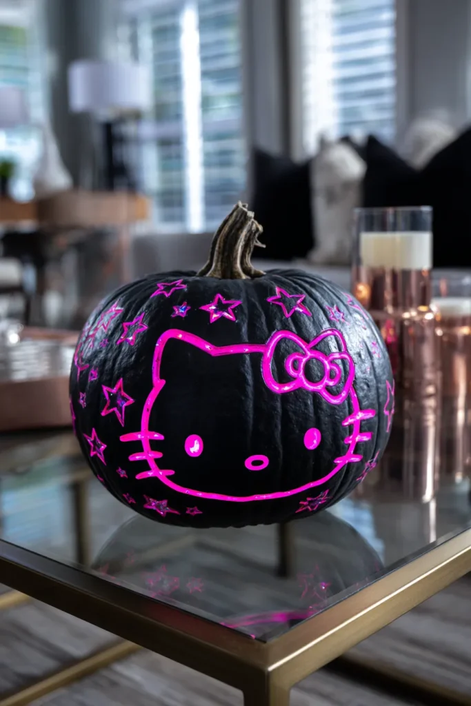 A bold black pumpkin glows with neon pink Hello Kitty outlines. The design pops with stars and details that shine brightly against the dark background.