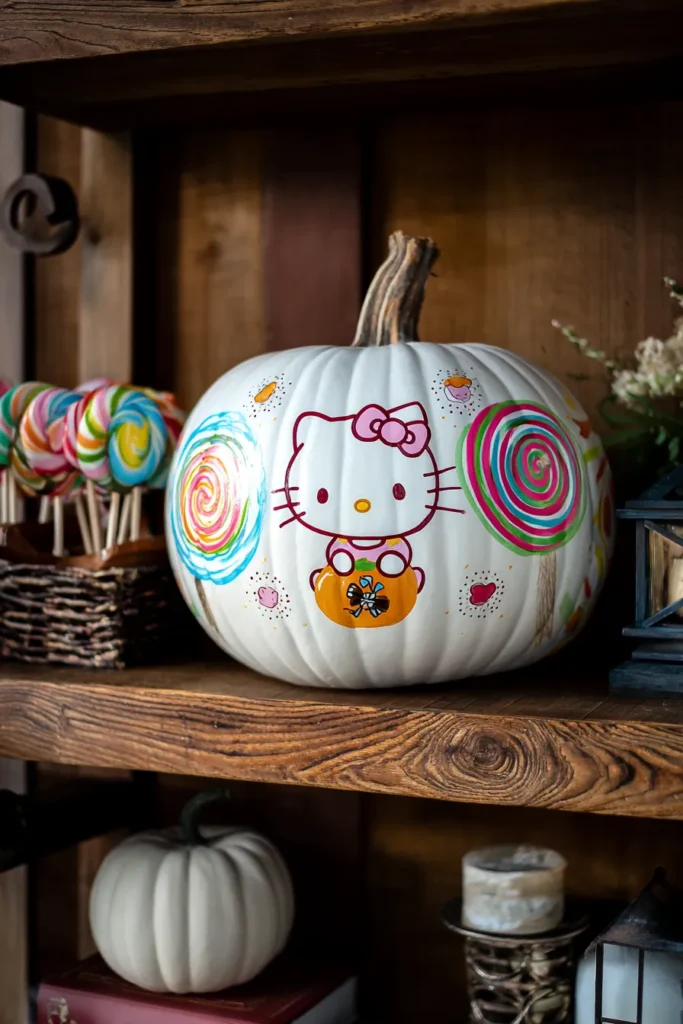 This pumpkin is painted white and features Hello Kitty surrounded by giant lollipops in bright rainbow colors. The whole design feels cheerful and fun, like stepping into a candy shop.