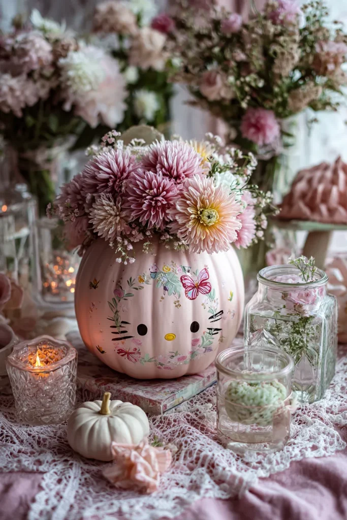A pale pink pumpkin has Hello Kitty’s face painted with butterflies and flowers surrounding it. The top is filled with real fresh flowers, turning it into a mix between décor and floral arrangement.