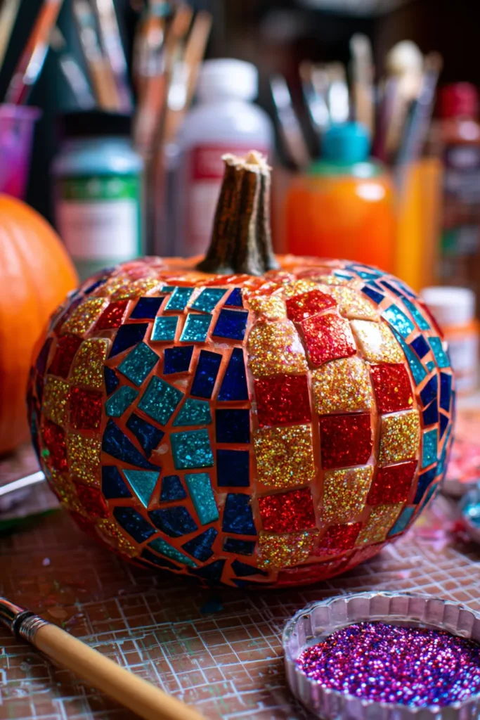 This pumpkin is decorated with tiny colorful squares of glitter arranged like a mosaic. Shiny reds, blues, and golds sparkle across the surface, making it look like a glowing piece of art.