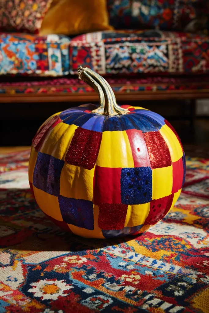 This pumpkin is painted in a checkerboard pattern of red, yellow, and blue squares, some sparkling with glitter. The bold blocks of color make it look like a patchwork quilt, turning the pumpkin into a cozy, crafty decoration.