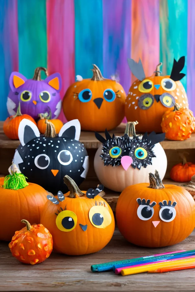 A whole group of pumpkins has been turned into cute animals and owls with painted faces, big paper eyes, and fun details like ears and feathers. Each pumpkin has its own personality, from a bright purple cat to a wide-eyed owl.