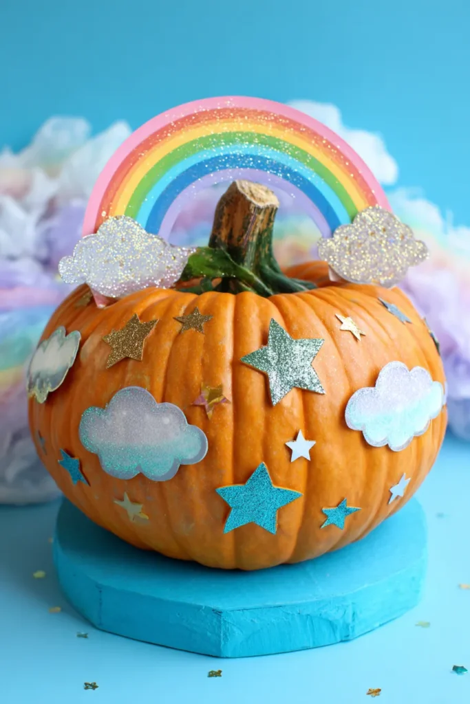 This pumpkin is decorated with glittery stars, shiny clouds, and a rainbow topper that arcs across the stem. The mix of sparkles and soft pastel colors makes it feel magical, like something out of a fairytale sky.