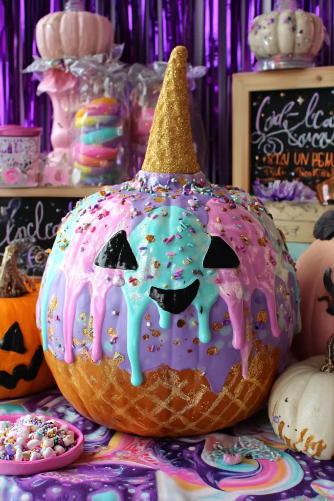 This pumpkin is painted to look like a giant ice cream cone with pastel “drips” of pink, purple, and blue. Sprinkles, glitter, and a golden cone topper finish the sweet design, making it look like dessert come to life.