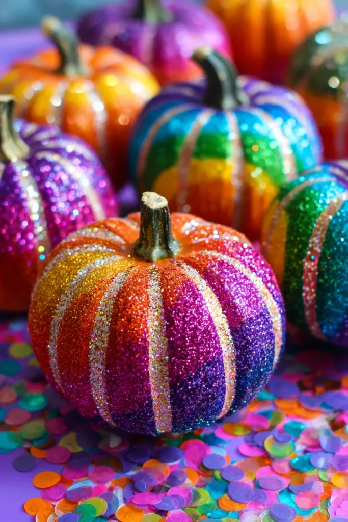 These pumpkins shimmer with every color of the rainbow, coated in bold stripes of glitter that sparkle under the light. The mix of pinks, oranges, purples, blues, and greens creates a dazzling display that feels almost magical. Scattered confetti around them makes the whole setup look like a party waiting to happen.