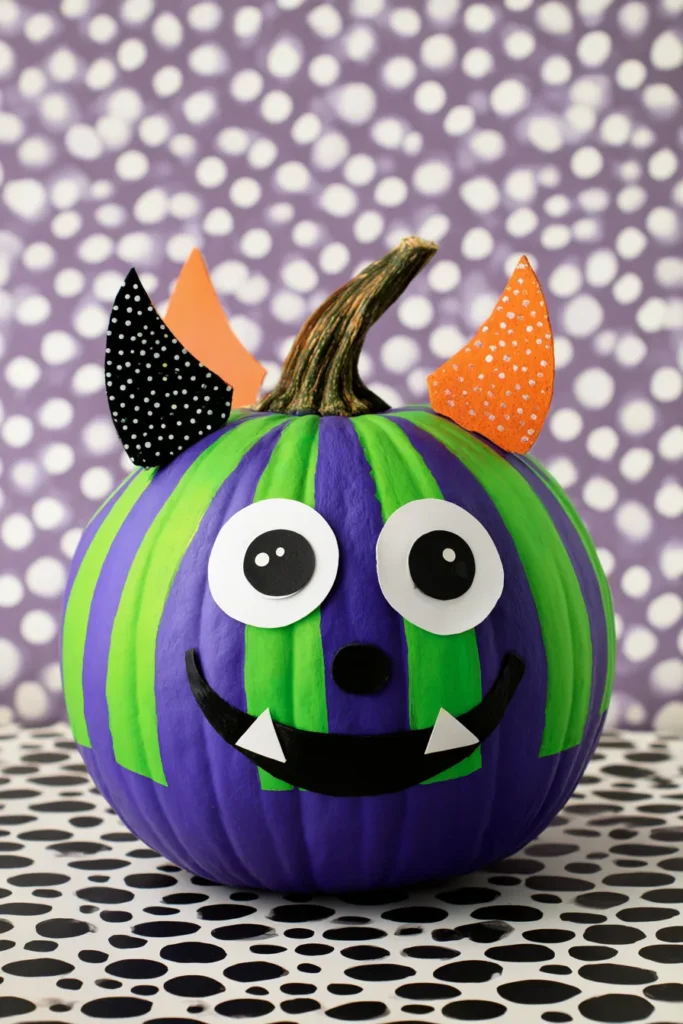 Painted in bright purple and green stripes, this pumpkin comes alive with a grinning monster face. Big round eyes, pointy teeth, and colorful cardboard ears make it the cutest little creature instead of something spooky. It’s bold, goofy, and kid-friendly all the way.