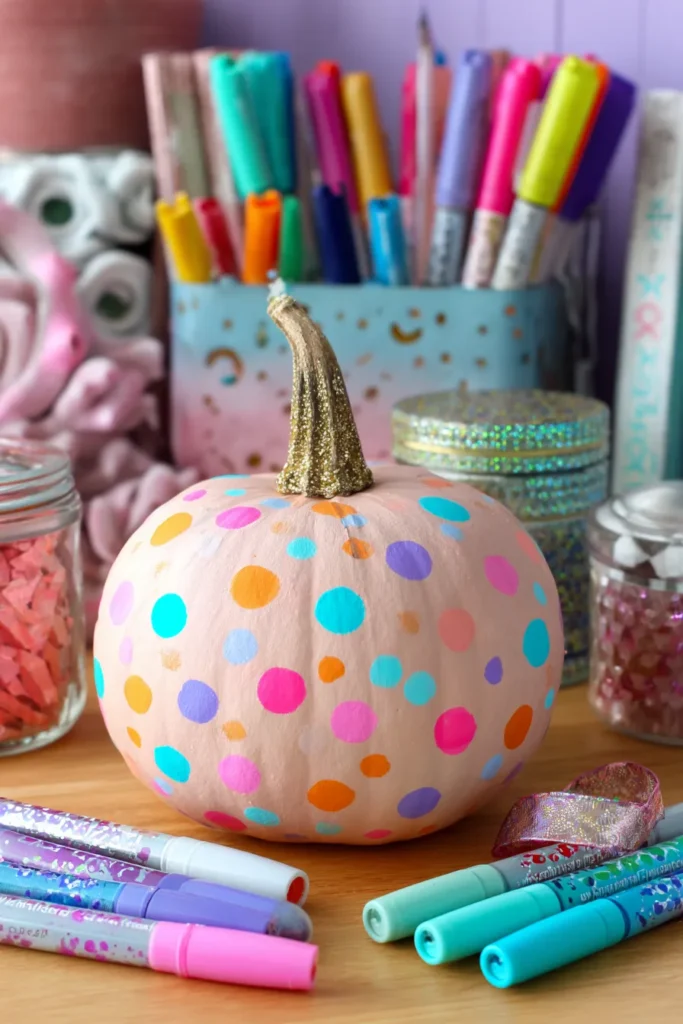 This pumpkin is covered in bright, colorful polka dots against a soft pink base. The dots in orange, teal, purple, and blue pop with cheer, while the glittery gold stem adds the perfect finishing sparkle. Surrounded by markers and glitter jars, it looks like the ultimate kid craft station.