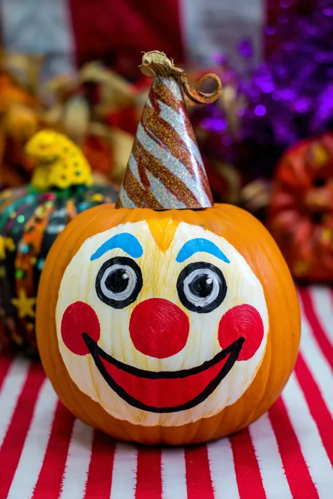 This pumpkin has been painted with a cheerful clown face, complete with big red cheeks, bright blue eyebrows, and a wide smile. A sparkly striped party hat sits on top, making it look ready to entertain at any fall carnival. The bold red and white striped table beneath it adds to the circus vibe.