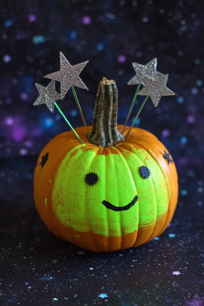 This pumpkin is painted with a bright neon green face against its orange base, complete with a simple happy smile and sparkly star decorations. Glittery silver stars on sticks pop out from the top, making it look like a little space friend ready for adventure.
