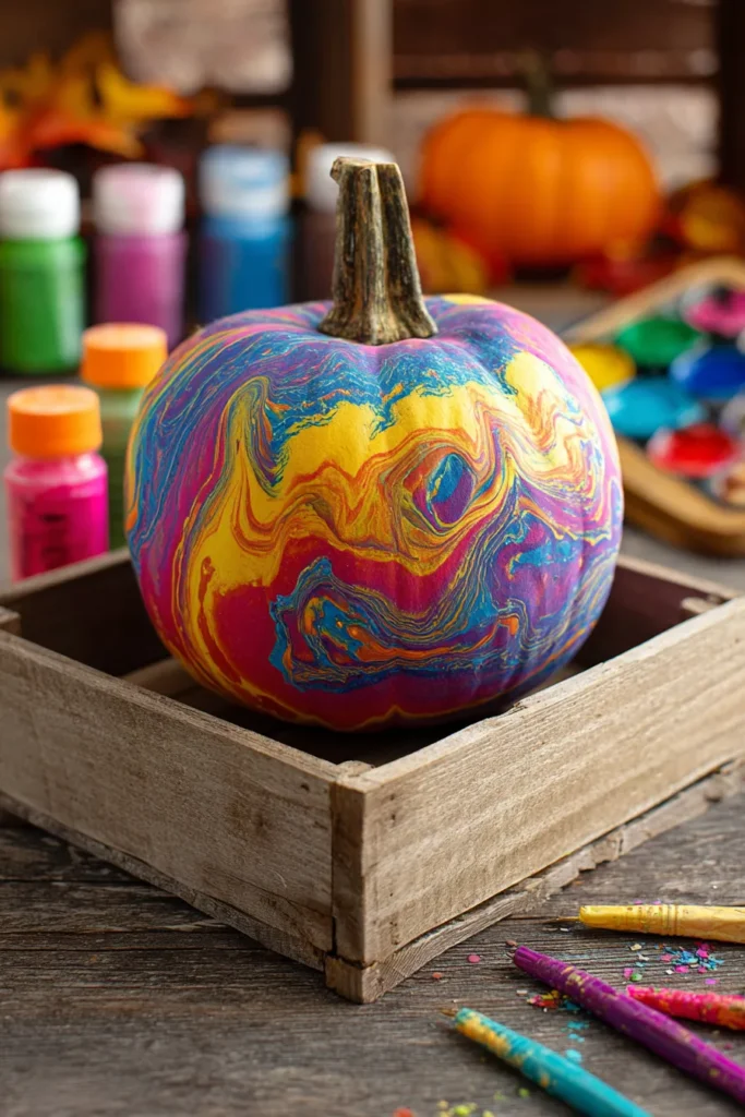 Painted with a swirl of rainbow colors, this pumpkin looks like a spinning tie-dye shirt. Bold streaks of yellow, pink, blue, and purple blend together in a marbled pattern that feels full of movement and energy.